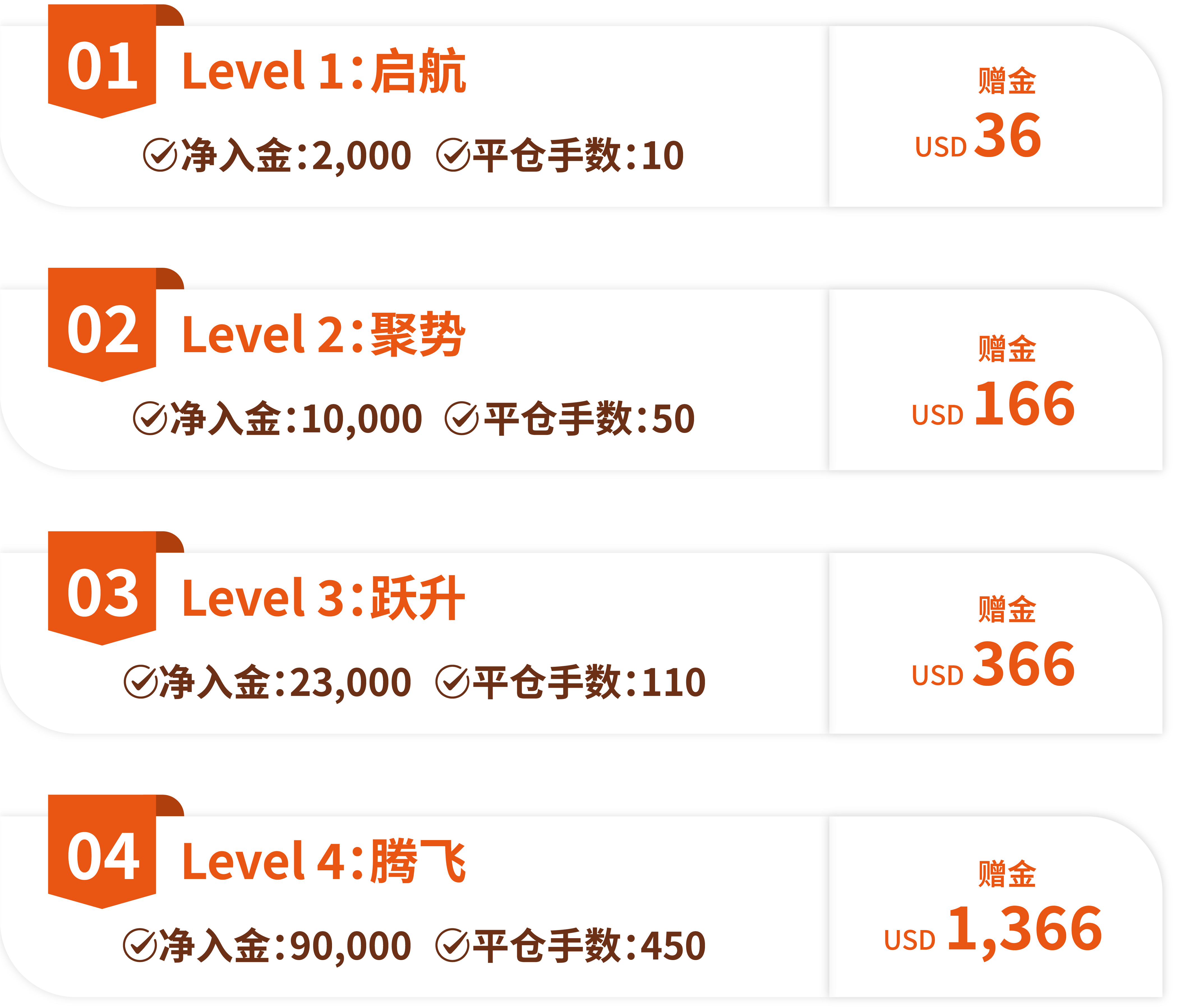 从启航到传奇,八大层级逐级解锁!活动期间内,达成指定净入金与平仓手数,即可解锁对应层级赠金奖励,最高可享 $36,666赠金回馈。