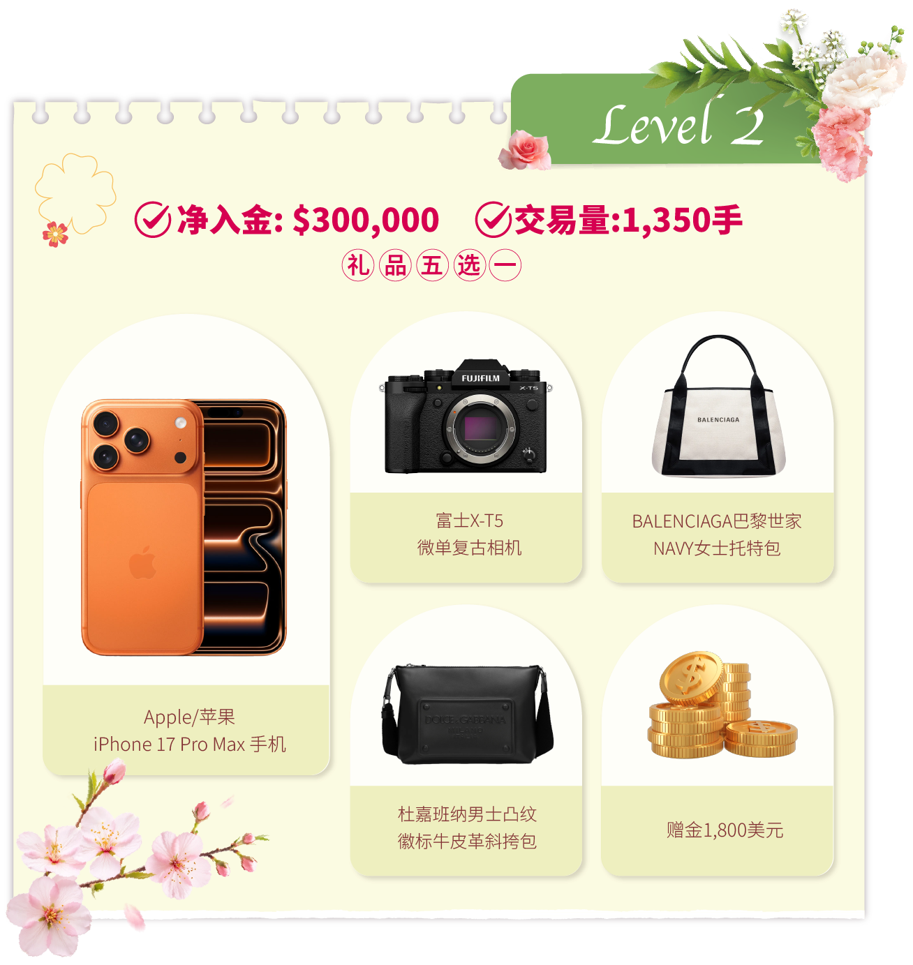 在活动期间内,客户的净入金和平仓手数(美股产品不计算在内)达到相应要求,即可在该层级的五件精选礼品中任选其一。若通过亨达APP完成交易,平仓手数将享有三倍累计计算,助您更快达成目标!