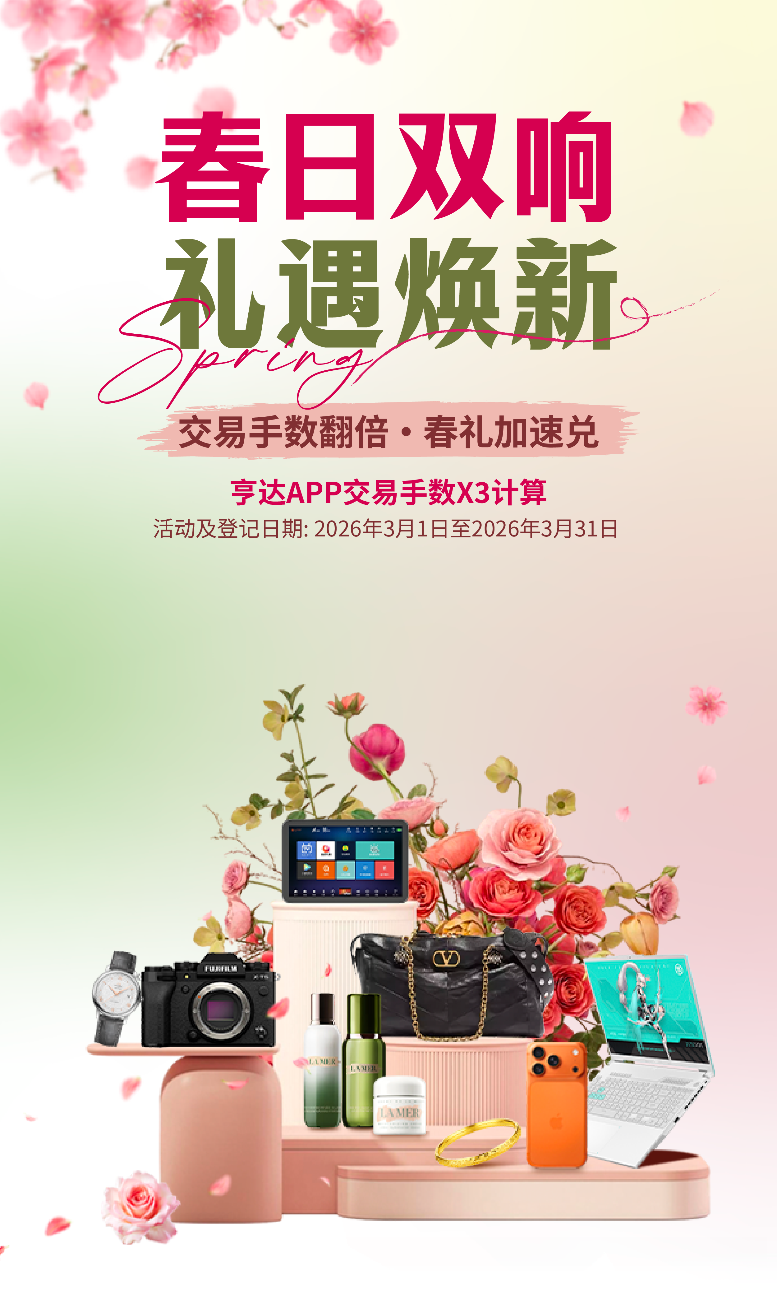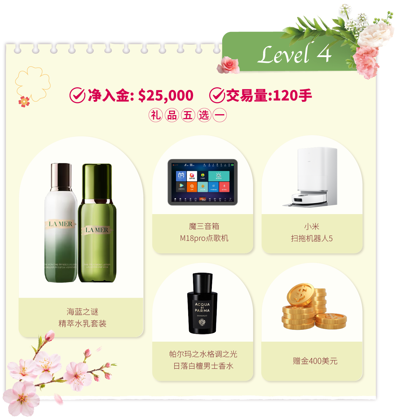 - 活动内容: 客户在登记活动后,活动期间内的净入金和平仓手数(美股产品不计算在内)达到相应要求,即可在层级的奖品进行五选一。若使用 亨达APP进行交易,其平仓手数将 按X3倍计算。例如:客户在MT4平仓手数10手及在APP平仓手数10手,实际计算手数为10 + (10×3) = 40手。